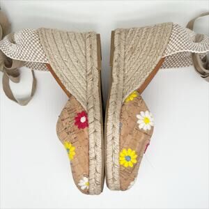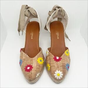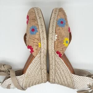 Tan cork upper with colorful embroidered flowers. Woven back with tie that goes around ankle. Espadrille wedge sole measures 3.5" tall. Retail $169. In great condition. EU size 38. According to website the size would convert to a US 7-7.5.