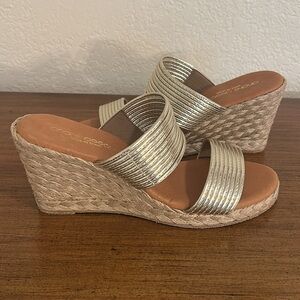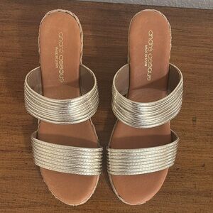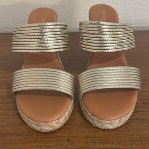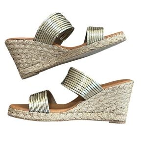 Stylish gold espadrille wedges. Features double strap design. Comfortable and chic.