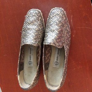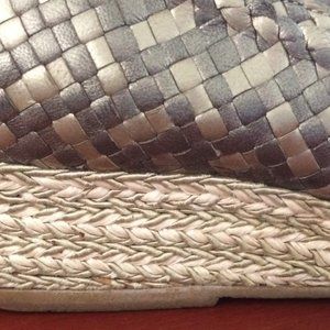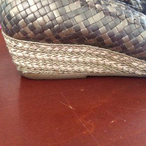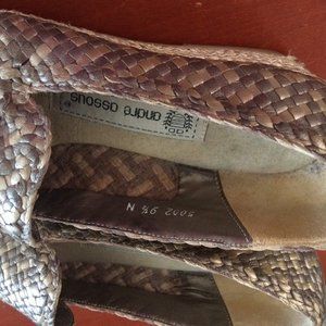 Andre Assous, made in Spain, gold bronze leather weaved espadrille wedges, slip-on loafer, square toe