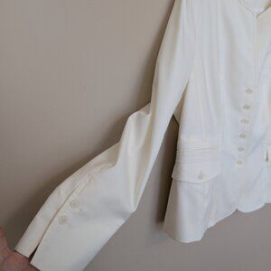 Light stretch white jacket button front. Please see last three photos for very light marks on jacket.