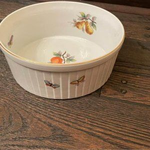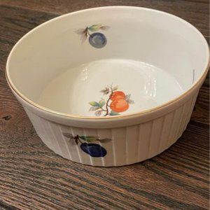 Details: This is a really pretty souffle dish in a colorful pattern called "Fruit" by Andrea by Sadek. This is part of an entire dinnerware pattern that included not only plates, cups, etc., but also bakeware, and other items. Each piece has the same gorgeous bright white porcelain with colorful fruit all around, some don't have the gold rim, this one does. The outside has that wonderful, texture that is so desirable in souffle dishes. It's a very versatile pattern that can be "dressed up" for an elegant table or buffet, but with it's fruit and butterfly theme, it's perfectly at home in a country, farmhouse or more casual setting. It is stamped on the bottom: "Fruit Oven to Table Cookware 7333". We love the look of this piece, it would make a beautiful addition on your dinner table, or on a breakfast buffet table, or simply as decor.