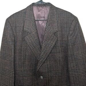 Andre Villard Plaid Check sport coat size 40S. Double button closure and a notch lapel. Two front flap pockets and two sides interior pockets. Check/plaid pattern of browns,black and even rust and blue. Excellent condition! Measurements: length- 30 inches, Chest (underarm to underarm)- 21.5 inches and Sleeve length (from shoulder seam to cuff)- 24.5 inches. 100% wool.