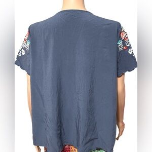 Andrée by UNIT Blouse M Embroidered Floral Boho Blue Rayon Top Short Sleeve