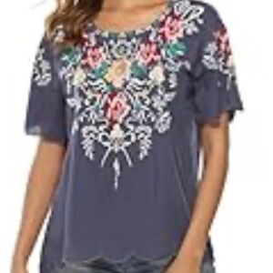 blue boho-inspired top features vibrant floral embroidery across the front and sleeves, with delicate scalloped edges for an extra touch of charm. Made of 100% rayon, it’s soft, breathable, and ideal for warm-weather styling.