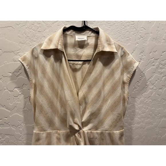 EUC Boutique brand ANDRE BY UNIT. Tan and cream striped 100% cotton/linen faux wrap dress. Elastic waist. Back seam detail. Classy. Perfect for those warm days or nights. Everything about this piece is chic.