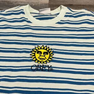 Andre the Giant Obey Blue White Striped Mens M Embroidered Sun T-Shirt MediumCasual. In great condition. 100% Cotton. Short sleeve, embroidered logo, striped, crewneck, casual streetwear retro cool fun classic
