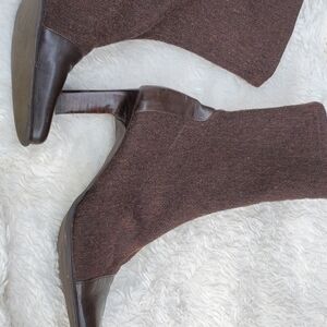 Stretchy wool top. I have a wool allergy and this never bothered me. The rest is leather with a rubber sole. Great condition. Stretchy top but for average size ankle.