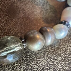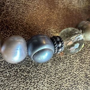 Each pearl is uniquely shaped with the organic ridges and curves typical of baroque pearls. Colors range from creamy white and soft peach to bronze, gray and peacock tones, with a soft iridescent luster. Oxidized sterling silver bead spacers and a faceted clear crystal/quartz accent bead add texture and sparkle.