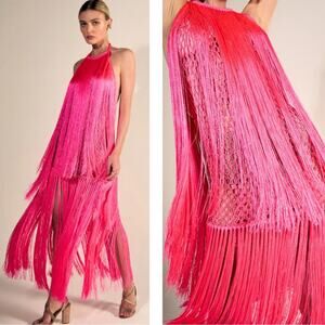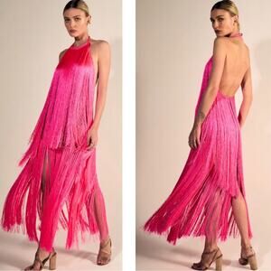 NWT ANDREA ALMEIDA Pink Bel Crochet Fringe Tiered Maxi Dress is marked as a Size Large but fits more like an XS/S and is brand new with tags!