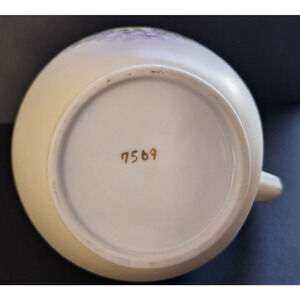 This Andrea By Sadek Porcelain Pastel Floral Design Pitcher is 6.5" tall and 5.5" wide including the handle. The side where the handle is located is flat. Highlights are the gold trim and unusual shape. This is an estate sale find. No chips or cracks.