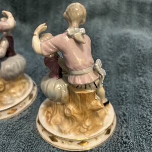 The product is a set of two hand-painted vintage porcelain figurines from Occupied Japan. These collectible decorative items are made from ceramic and porcelain, featuring a beautiful multi-color design that adds a touch of elegance to any space. Hand-painted details give these figurines a unique and artisanal quality, making them a charming addition to any collection or decor. Perfect for those who appreciate vintage items with a touch of Japanese craftsmanship.