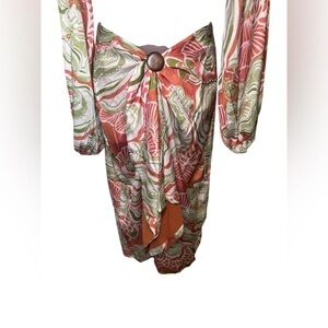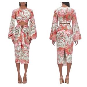 Andrea Iyamah Behati 2-piece set in the Mushroom print, brand new with tags. This eye-catching matching set includes a balloon-sleeve crop top with a twist front and tie detail, and a high-waisted midi skirt with a back slit for added movement. Flattering silhouette perfect for resort wear, vacations, events, or summer weddings.