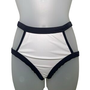 New Andrea Iyamah black and white high-waisted bikini bottom in size Small. Striking colorblock design with bold black contrast trim and sheer cutout paneling at the sides. This fashion-forward swim bottom offers a flattering, modern silhouette and is perfect for resort vacations or summer poolside looks.