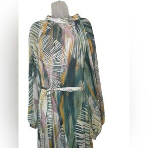 Stunning Andrea Iyamah “Sade” sheer swim coverup in a vibrant multicolor floral print. Flowy, lightweight maxi-length silhouette with a high neckline, long balloon sleeves, and a removable waist tie for an adjustable fit. Perfect for resort wear, beach vacations, or poolside lounging.