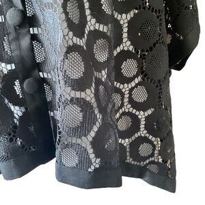 Andrea Jovine Black Lace Jacket With Linen Collar and Trim Size M. A beautiful lacy jacket. Covered Buttons, Linen collar and trim. Boxy shaped, loose fit. The lace is not lined so is seethrough. Excellent, like new condition. Size M.
