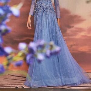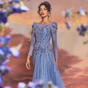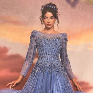 Exquisite azurite gown with intricate beading, layered glitter tulle, and a belted waistline. A long sleeve, romantic design that brings fairy-tale elegance to any enchanted occasion. Perfect Ball Gown for Weddings, Galas & Special Occasions.