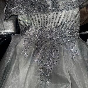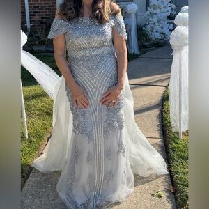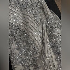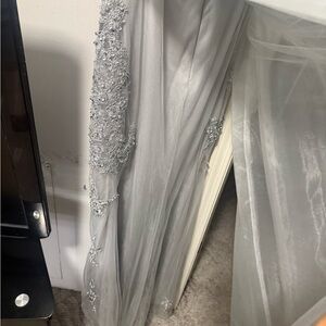 Step into elegance with this stunning off-shoulder gray evening gown. Perfect for special occasions, this dress features intricate detailing and a flowing silhouette