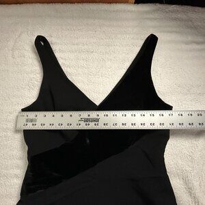 This striking mini dress from Andrea Polizzi for Rex Lester features a rich black velvet fabric with subtle vertical stripes, sleeveless cut, and full lining. Perfect for evening wear or statement styling—chic, bold, and ready to turn heads.