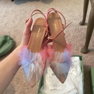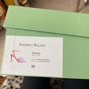 Never worn, still in box ombré tulle heels from designer Andrea Wazen. Purchased for a Babyshower and they never worked out. Satin pink wrap heel around ankle. Stunning, super unique.