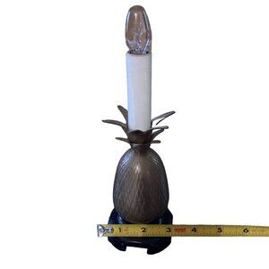 Up for sale is this an Andrea by Sadek Vintage Mini Bronze Pineapple Lamp that was made in Taiwan R.O.C. It measures 8" tall without the bulb and 11 1/2" tall with the shade. It is in excellent working condition as shown in the photos. It features a wooden base that measures 2 3/4" square. The metal pineapple is Antique Bronze. The shade has some broken pieces in the interior plastic but does not affect the look. The shade has also been modified to fit the tiny night light. It can be used with or without the shade.