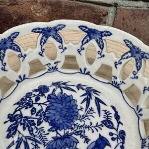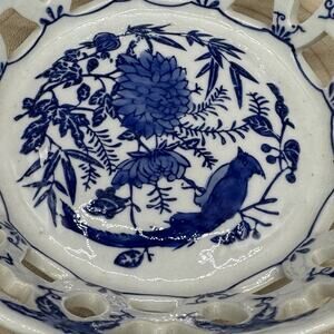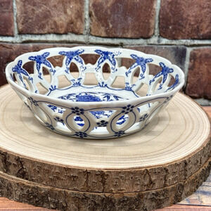 Andrea by Sadek Decorative Reticulated Scalloped Bowl Blue White Floral Pheasant