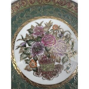 Crafted with an eye for the elegance of yesteryear, this Andrea by Sadek Floral Decorative Plate is a charming addition to any collection or home decor. The plate showcases a delicate floral pattern set against a lush green backdrop, accented beautifully by a pink and gold trim that catches the eye with every glance.