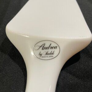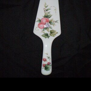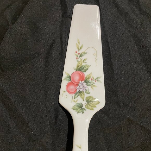 “Andrea” by Sadek porcelain pie server. Made in Japan with a floral design (pink floral and fruit design) sometimes referred to as “Peach Blossom,” “Province,” or “Victorian Rose” patterns.