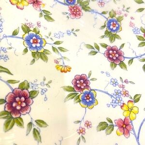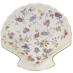 This Andrea by Sadek shell serving dish was made in Japan. Floral design in hues of berry, pale yellow, blue, pink and green. Green trim. Porcelain. Like new- no chips or flaws Floral design may be corona. Sticker from fine department store In nyc- A & S still on bottom.