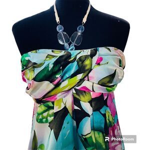 Andrea Behar floral mini dress featuring a beaded halter neckline and bold multicolor print. Lightweight flowy fabric with beautiful drape — flattering, feminine, and perfect for weddings, garden parties, vacation evenings, or a night out.