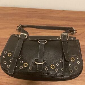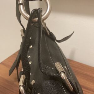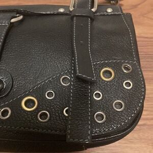Andrea Mabiani black genuine leather shoulder bag with adjustable straps. Silver tone and gold-tone grommet details, silver tone hardware, 2 snap magnetic closure and inside zipper pocket. Preowned gently used in excellent condition. Made in Italy.