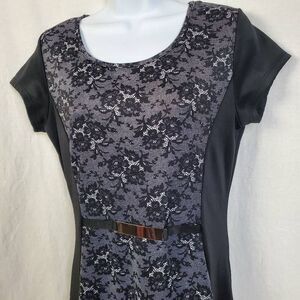 Elegant and figure-flattering, this Andrea Missy sheath dress features a beautiful black lace overlay on a gray panel front and back, contrasted by slimming solid black side panels. It has a cap sleeve cut, scoop neckline, and an attached belt at the waist for added shape. Perfect for business events, church, or cocktail outings. No size tag was found, but estimated fit is a Women’s Medium based on measurements—please check below to ensure the best fit.