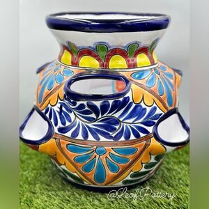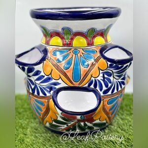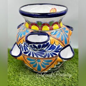 Dimensions: Med 10.5”H x 9"W x 7.5"D, weight 4lbs 10.8oz, Materials: Ceramic & Clay, Color: Multi Colored, Drainage hole, Made in Mexico, Strawberry Talavera Veranda Planter is vibrant in color and design. Traditionally used for growing strawberries, this planter is perfect for bringing life into any small space with its' bright colors and pockets that are great for growing multiple plants. Don’t forget to dress up your plants 🪴