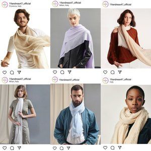 19 Andrea's 47 Luxury gauzy 100% cashmere made by hand on vintage shuttle looms. The fineness of the cashmere is unmatched by most of what you see in today’s market leading to an exceptionally soft garment. This model is made up in a soft cashmere that’s exceptionally warm and features a subtle blue gray mottled hue. Not white; light grey with cool blue tones.