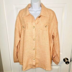 Andree Oversized Pearl Button Down Tweed Shacket Peach Size Medium. Large Pearl buttons. Heavy weight shirt lightweight jacket. Non-stretchy tweed woven. Banded cuffs with button closure. Collared. 2 front deco pocket details. 2 real side pockets. Cream, Tawny, and Melon threading throughout. Unlined. Imported. Self: 100% Polyester. Contrast: 100% Cotton. NWT