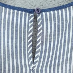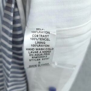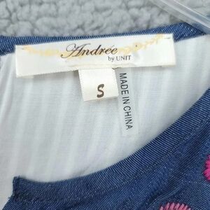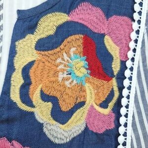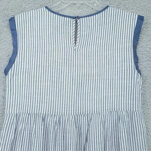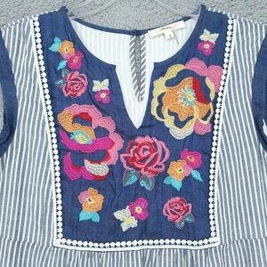A chic Andree dress in size small with blue and white stripes adorned with floral embroidery, ideal for versatile occasions.