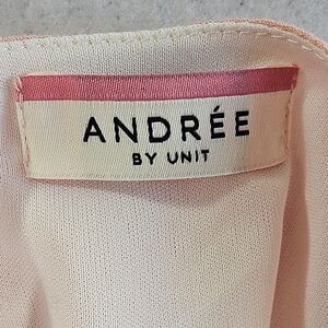 The size tag and fabric tag are missing. Please see measurements in the photos. According to the Andree by unit size chart, this should be a size 4 USA. I believe the material is Rayon but could be a rayon polyester blend. Not exactly sure.