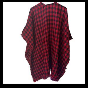 Andree by Unit Red & Black Plaid checkered Fringe shawl Poncho one size acrylic