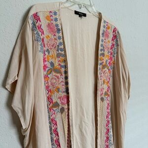 Andree by Unit Tan Floral Embroidered Open Kimono Size S Boho Hippie Festival