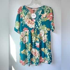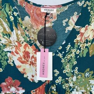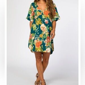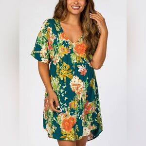 Lovely teal and orange floral Andree by Unit short sleeve babydoll silhouette dress with v-neck and empire waist. The fully lined skirt is lightweight and falls beautifully. The waist is ruched and the dress is maternity-friendly.