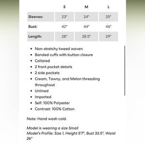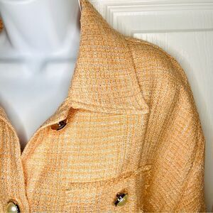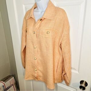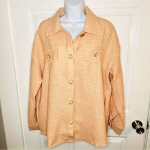 Line Lush Boutique Andree Oversized Pearl Button Down Tweed Shacket Peach Size Medium. Large Pearl buttons. Heavy weight shirt lightweight jacket. Non-stretchy tweed woven. Banded cuffs with button closure. Collared. 2 front deco pocket details. 2 real side pockets. Cream, Tawny, and Melon threading throughout. Unlined. Imported. Self: 100% Polyester. Contrast: 100% Cotton. NWT