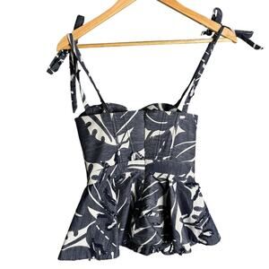 Andres Otalora Ciudad Perdida Top in Navy Print. Size 0. Features sweetheart neckline, sleeveless, tie straps, frayed details, printed, hidden back zipper closure, and peplum style. NWT / New with tags.