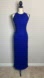 This stunning royal blue evening gown features a fitted silhouette that accentuates the figure. The front showcases a high neckline with intricate beading details that add texture and sparkle to the dress. The back is the showstopper, with a strappy criss-cross open design that brings an alluring edge to the classic elegance. The floor-length gown flows smoothly to the ground, creating a timeless and sophisticated look.