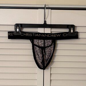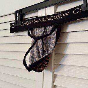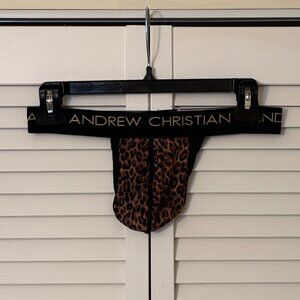 Andrew Christian Y-Back Thong in leopard print. Faded size tag, but appears to be Small.