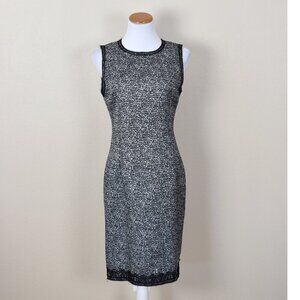 Black lace bottom hem. Black fringe trim around neck and arms. Fully lined. Back zipper.