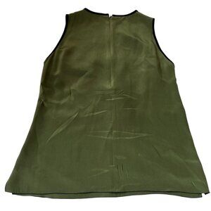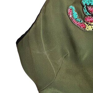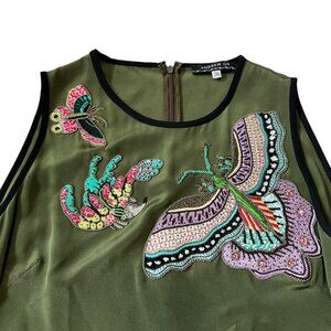 Andrew GN sleeveless top, olive green with black trim, very ornate sequin design of moths / butterflies, round nec, lightweight silky fabric, FR 36 / US 4, pit to pit: 18", length: 25", preowned and has discoloration, no care/fabric content tag - see photos