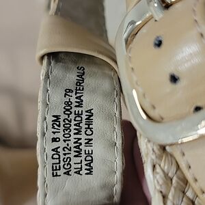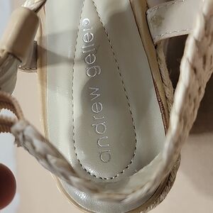 Unique Andrew Geller "Felda" Wedge sandals. Natural color Woven/braided upper and trim, heel is 3". Size 8.5. Worn once, great condition! Adhesive residue as shown in last photo and small spot below brand name on right shoe nicked from where I tried to remove the residue. Not visible when wearing.