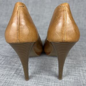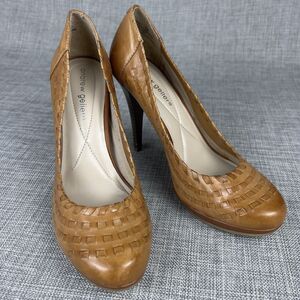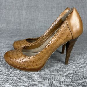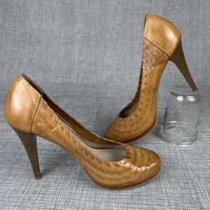 Andrew Geller Sz 7 Whisky Brown Woven Leather Platform Pumps Wood Stiletto Heels