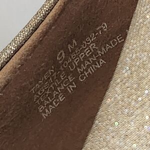 Elevate your style with these Andrew Geller Tayen gold glitter open toe heel pumps. The stiletto heel adds a touch of glamour to any outfit, while the cushioned insole provides comfort throughout the day. These slip-on pumps are perfect for any occasion, from a night out on the town to a formal event.