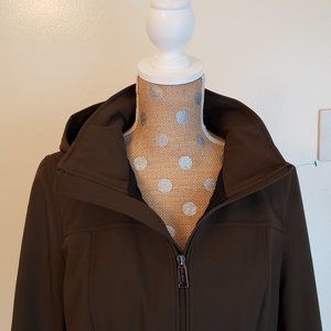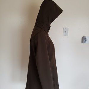 Pre-Owned - Andrew Marc 4-Way Stretch Detachable Hood- Water Repellent Zip Up Jacket. Size medium. Measurements laying flat are from arm pit to arm pit 20 inches - Top of collar to bottom hem 33.5 inches. Jacket is in nice condition except for two marks. ( both are shown in photos) Please see photos for a visual discription. . Material : Shell Face 94% Polyester & 6% Spandex - Shell Back 100% Polyester -Lining 100% Polyester Exterior 94% Polyester & 6 % Spandex. Questions welcomed
