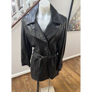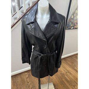 Andrew Marc Additions Black Leather Belted Double Breasted Trench Coat Jacket M